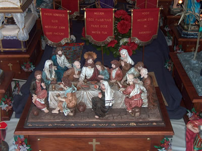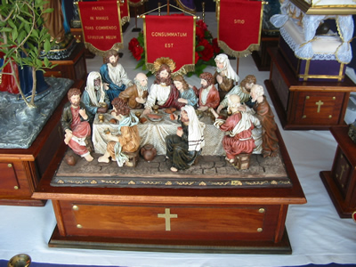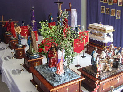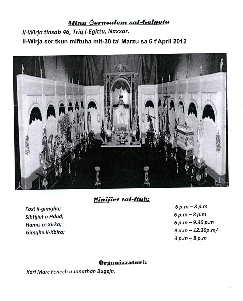 Nistedinkom biex meta jasal iz-zmien tal-Gimgha Mqaddsa tigu izzuru din il-wirja u b’hekk tithejjew tajjeb ghall akbar festa tal-Knisja – Il-passjoni, il-mewt u l-qawmien tas-Sidna Gesu’ Kristu. Fl-2005, ghamilt il-bankuni tal-ghaxar vari, minghand Albert Debono. Fl-2006 xtrajt ir-raghaj it-tajjeb u zidd bankun iehor ghall-Hadd il-Palm. F'din is-sena Alfred Cauchi hadem l-fanali fuq l-10 vari kif ukoll zidna l-bandalori. Fl-2007 l-Wirja kompliet tizdiet b'serduk, haruf ghas-sepurklu u Appostli li nxtraw minghand Saulus. Fis-sena 2007 zidd ukoll il-Fjoretti li hadmithom Gina Galea. Alfred Cauchi hadem ukoll Lampieri u sepurklu, filwaqt li n-navi ser jaghmilhom Manuel Pisani. Kris hadem l-angli tas-sepurklu. Ghall din is-sena ser ikolli sepurklu gdid, irhamat u vari bil-lava verament sbieh. Din is-sena ser ikun hemm ukoll vara gdida li turi l-grajja ta Hadd il-Palm kif ukoll anglu gdid mal-vara ta l-Ort. Jekk jghogobkom ejjew araw din il-wirja. Ghas-sena 2008 ser issir l-Via Sagra u tmin fanali filwaqt li l-vari ser ikunu kollha go Knisja li hija mahduma fuq stil Toskan. F'din s-sena zidna ukoll l-arka tal-Pat. Il-Knisja hija verament sabiha u ghalhekk zgur li jekk tigu taraw l-wirja ser tiehdu pjacir. Fil-wirja tas-sena 2011 ser inzid l-linef man-navi kif ukoll pittura minghande Abram Bellia. Fis-sena 2012 ser inzid vara gdida tac-Cena minn Ghawdex u set ta 4 kurcifissi godda. www.holyweeknaxxar.com Din is sena ghandna dawn godda: Linef man-Navi u Pittura minghand Abram Bellia |